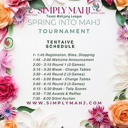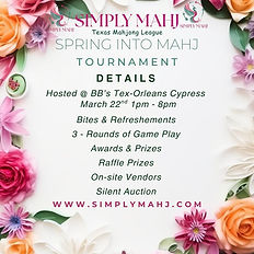 Join us for for our Spring into Mahj Round Robin! A Social Mahjong Tournament fostering Social Competitive Play! Simply Mahj & Texas Mahjong League presents Spring into Mahj Round Robin. A tournament like no other! This social tournament foster competitive social play, where you can enhance and show off your skills in a fun and exciting environment. Bring in the Spring season alongside friends and the community! Enjoy delicious food, shopping, camaraderie, friendly competition, and endless fun! • Complimentary Bites & Refreshments: Provided by Simply Mahj • Full Menu & Bar: Available for additional purchase from BB’s Tex Orleans. • Vendor Shopping: Arrive early to explore our vendor booths (Vendors TBD). • Goodie Bags: Take home a special goodie bag for everyone! • Raffle Tickets: Each participant receives a raffle ticket, with additional tickets available during the event. • Schedule: o 1 – 1:45 PM Registration, Bites & Shopping o 1:45 – 2:00 PM Welcome Accouncement o 2:00 – 6:15 PM 3 Rounds (3 games each) with Breaks o 6:30 – 7:30PM Awards & Raffle (Folllowed by our Silent Auction) *This schedule is an outline of events, full schedule will be shared closer to the event. • Awards & Prizes: o 1st Place – Mahjong Tile Set with Mat (Brand TBD) o 2nd Place – Mahjong Tile Set (Brand TBD) o 3rd Place – Mini Mahjer Set • Raffle Prizes: Tons of Mahjong Raffle Prizes (TBD) *** AVAILABLE SPOTS ARE LIMITED